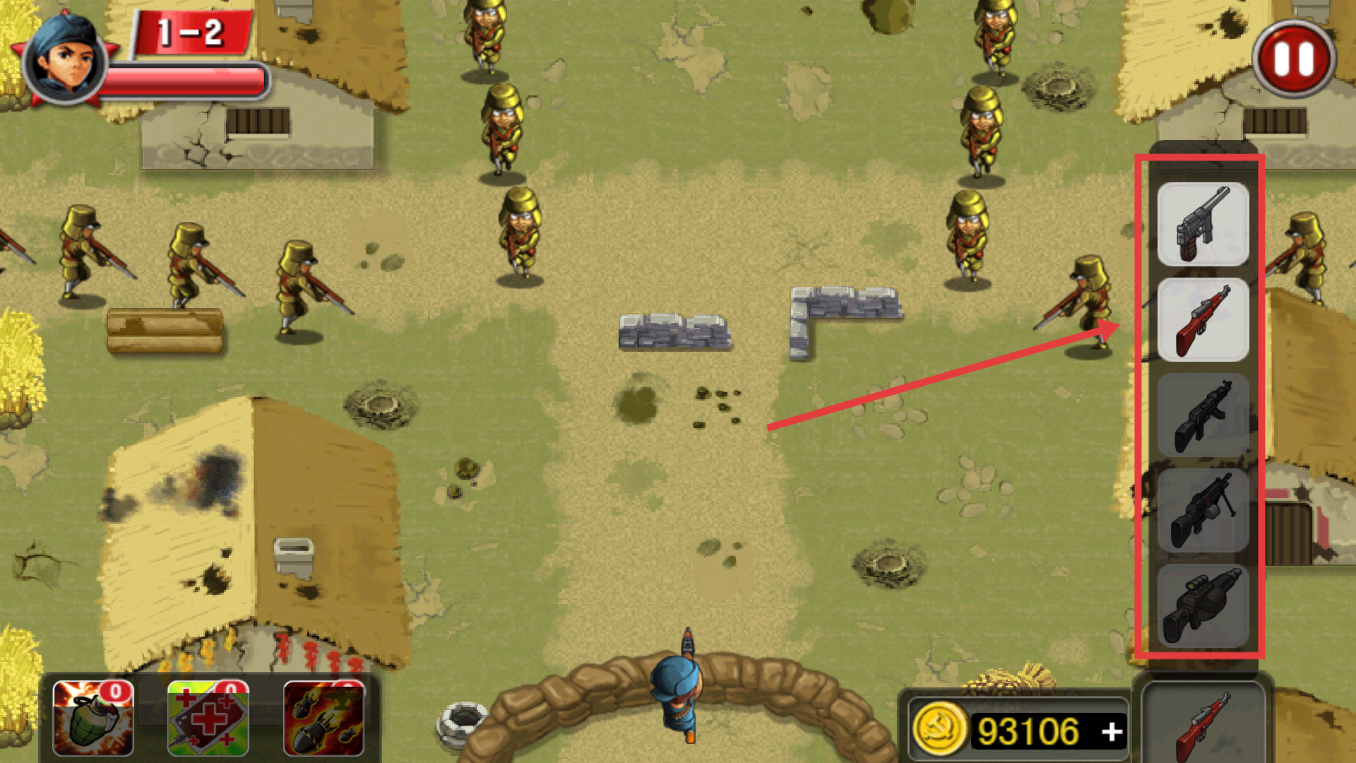 2、使用金币购买杀伤力强的武器装备,长按屏幕朝敌人方向连续射击,点击右侧图标切换武器类型。