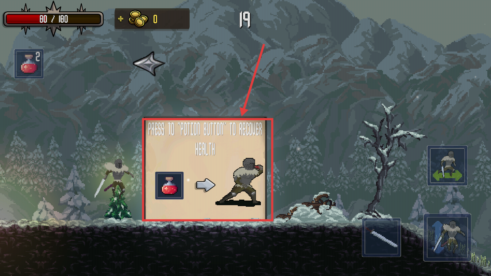 2、战斗中点击【POTIONBUTTON】使用血瓶恢复生命值,保持角色健康应对后续挑战。