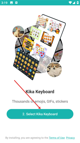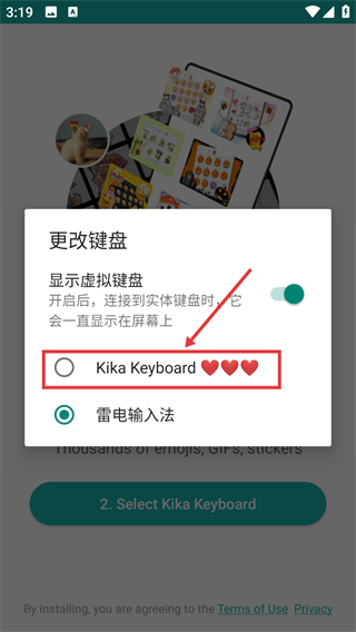 3、点击【SelectKikaKeyboard】按钮,进入输入法选择流程,这一步可让你将其设为常用的输入工具。