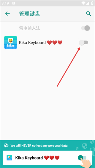 2、进入管理键盘页面,找到【KikaKeyboard】对应的开关并打开,激活系统权限,为后续将其设为默认输入法做好准备。