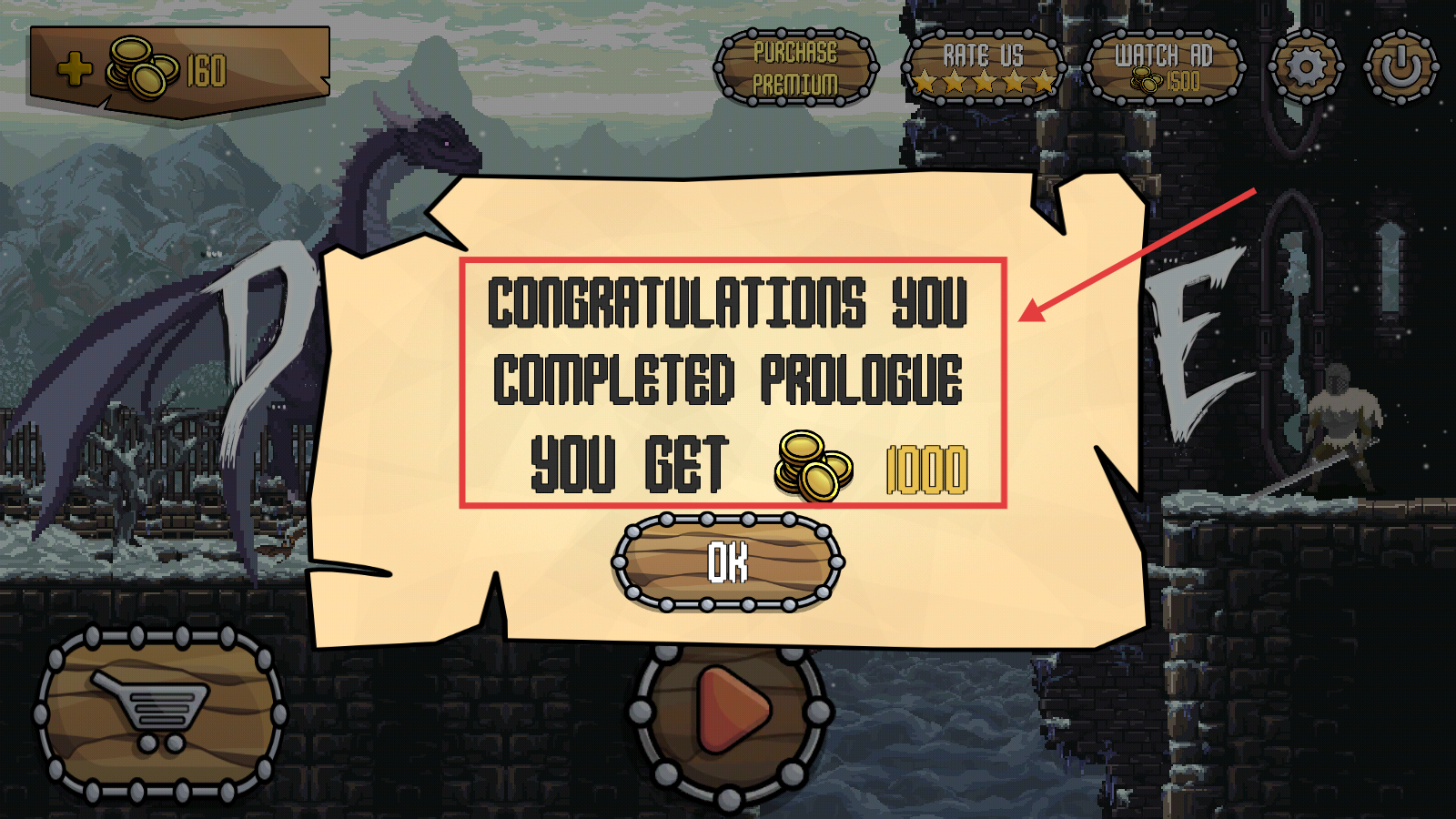 4、完成【PROLOGUE】可获得【1000】金币奖励,点击【OK】确认后继续探索地牢解锁更多内容。
