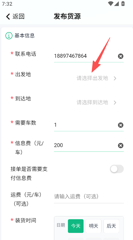1、支持发布新货源功能,进入对应页面填写联系电话、出发地等基本运输相关信息。
