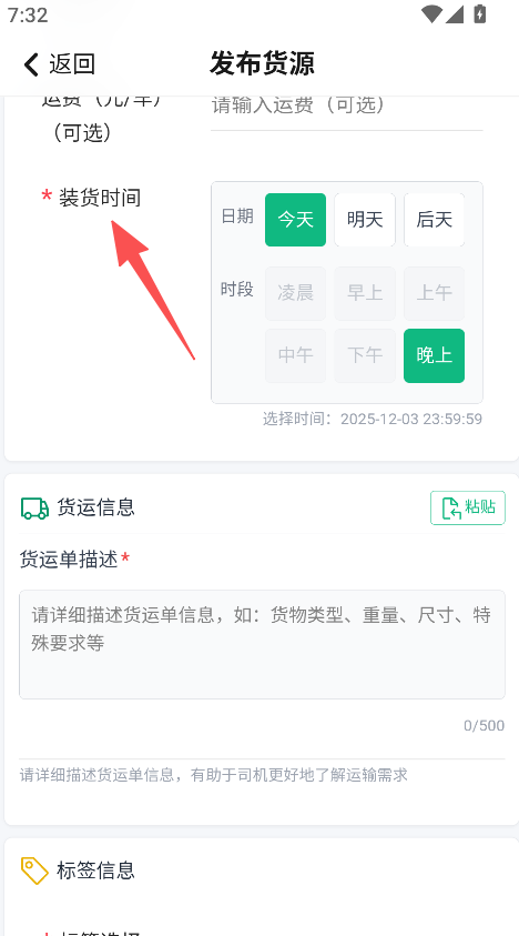 2、装货时间支持日期及时段双选,精准匹配实际装货安排,提升运输需求的准确性。