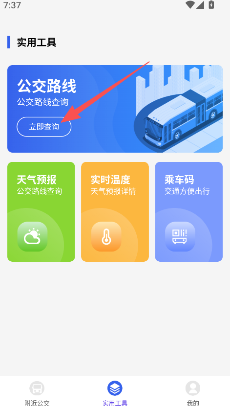 1、打开软件进入实用工具页面,点击公交路线的立即查询。