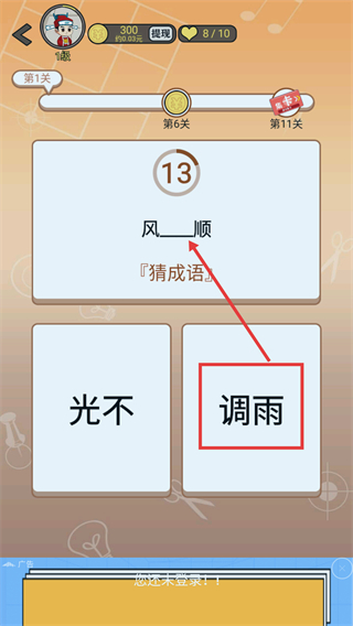 1、猜成语关卡题干为【风__顺】,选择选项【调雨】可组成成语【风调雨顺】。