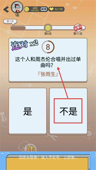 2、面对问题【这个人和周杰伦合唱并出过单曲吗?】,对应人物【张雨生】,选择选项【不是】。
