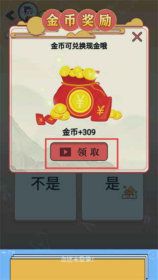 4、完成答题后,弹出【金币奖励】界面,显示【金币+309】,点击【领取】按钮获取,同时留意【金币可兑换现金】的提示。