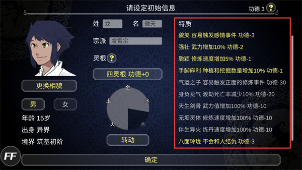 1、进入初始界面选择【四灵根】特质搭配【貌美】特质,用3点功德值为宗门开局奠定基础。