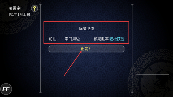 2、在除魔卫道界面点击【出发】按钮前往【宗门周边】,轻松获胜获取初始资源助力发展。