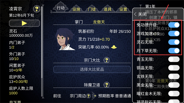 4、打开右侧功能菜单开启【免功德升级】【游戏加速】,快速提升宗门资源与发展效率。