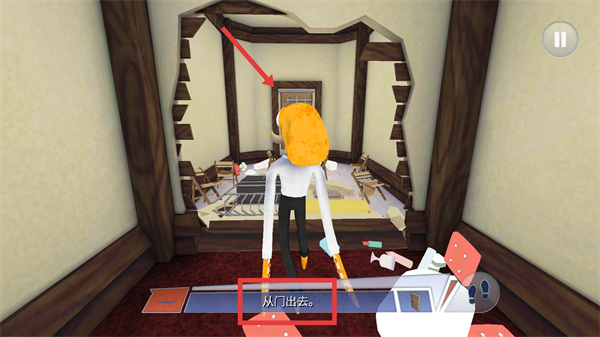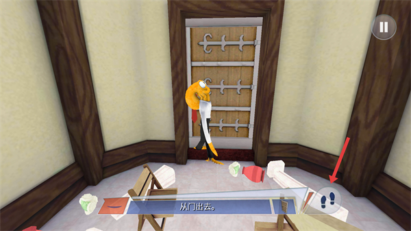 3、操控角色靠近门,通过箭头所指按钮切换成手部,完成【从门出去】的关卡任务要求。