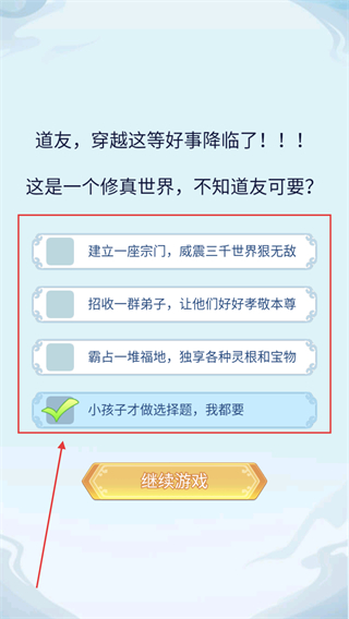 1、选择“小孩子才做选择我都要”选项,点击“继续游戏”开启宗门创建之旅,为后续招弟子建宗门打基础。