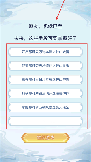 2、进入游戏后按引导完成基础选择,掌握护山大阵开启方法,为宗门发展奠定基础。