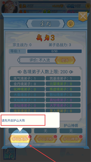 3、进入宗门界面先开启护山大阵,提升宗门等级,增加弟子战力,解锁更多功能。