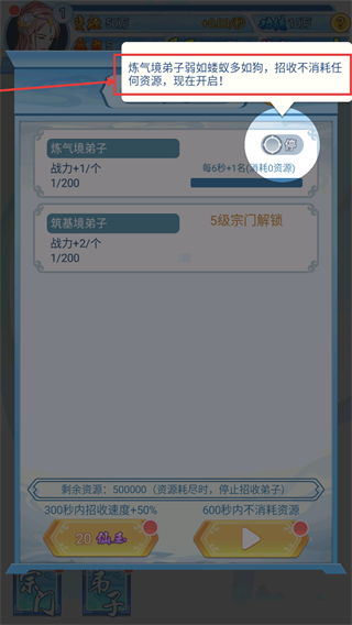 4、进入弟子招募界面先开启炼气境弟子招募,每6秒增加1名弟子,积累战力提升宗门等级。