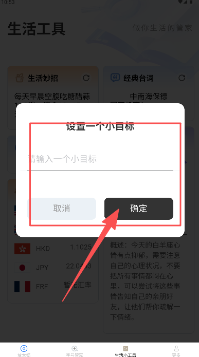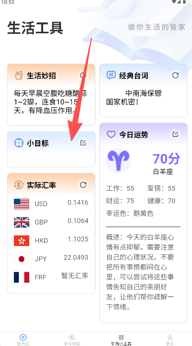 2、整合并分类展示生活妙招、经典台词、实际汇率、星座运势及小目标设定等多个日常生活辅助模块。