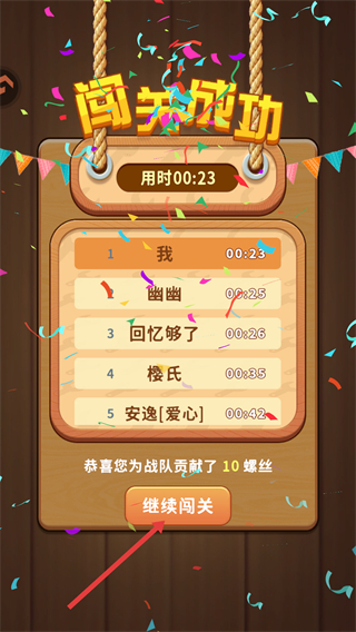 4、通关后界面显示【闯关成功】,点击【继续闯关】按钮,开启下一个关卡的挑战。
