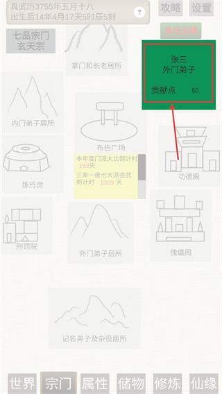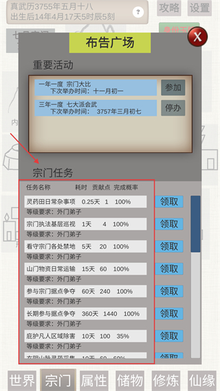 2、查看【身份玉牌】了解贡献点,熟悉宗门布局,去布告广场关注活动积累贡献。