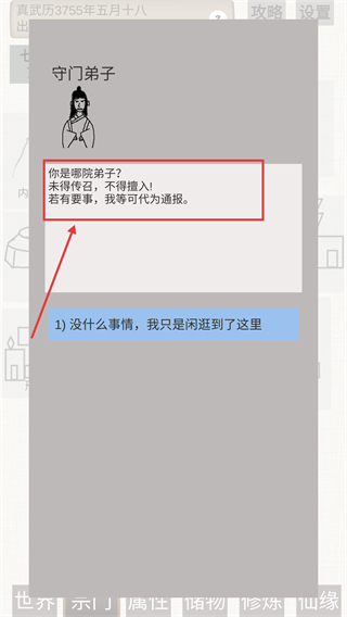 3、遇守门弟子询问选【没什么事情我只是闲逛到了这里】,避免冲突保持低调。