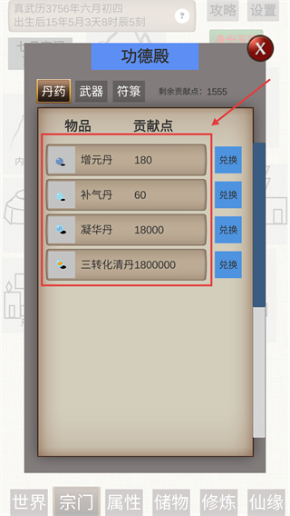 1、在【功德殿】-【丹药】界面,用贡献点兑换【增元丹】-【补气丹】等丹药,有效助力修炼属性提升。