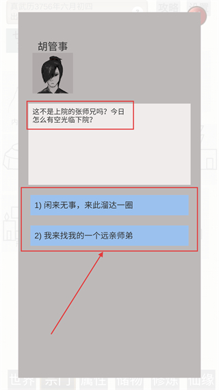 2、与【胡管事】对话时,选择【我来找我的一个远亲师弟】选项,触发后续远亲表弟互动剧情。