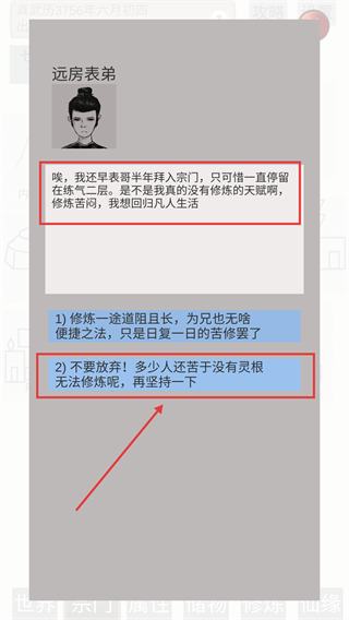3、面对【远房表弟】的迷茫,选【不要放弃!多少人还苦于没有灵根无法修炼呢,再坚持一下】稳定其心态。
