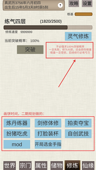4、修炼突破时注意提示,不必强求【100%】突破概率,避免失败损伤根基影响后续修行。