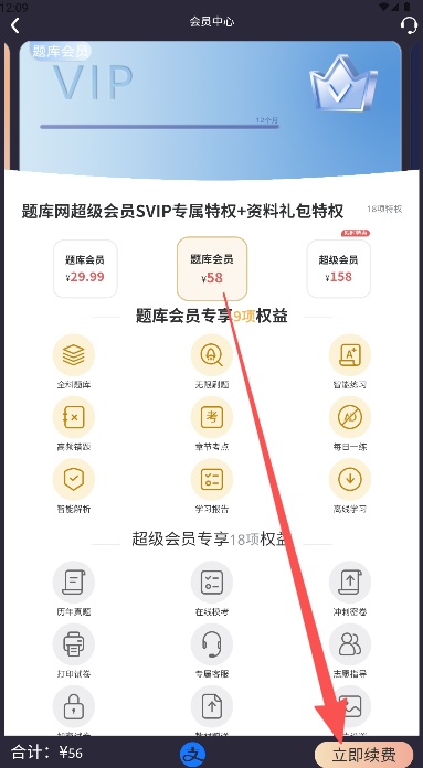 3、在会员中心可选择题库或超级会员点击“立即续费”。