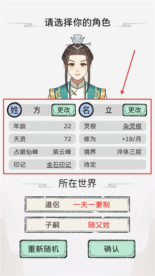 1、开局确认角色信息,若对姓、名或灵根等不满意,可点击重新随机,确保初始条件合适。