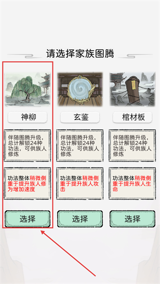 2、选择家族图腾时优先选神柳,其侧重提升族人修为增加速度,能助力前期快速发展。