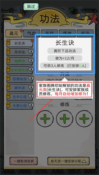 3、安排家族成员修炼初始解锁的真元类长生诀,每月自动增加修为以积累实力。