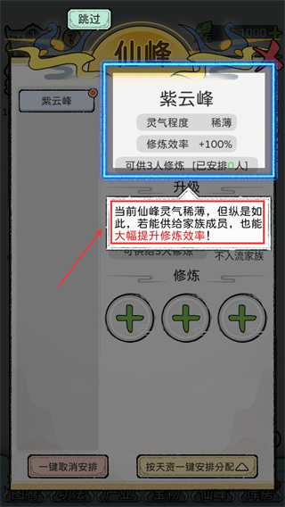4、安排族人到紫云峰修炼,利用其100%修炼效率,即使灵气稀薄也能加快修为增长。