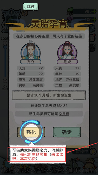 1、【灵胎孕育】时可借助家族图腾强化新生命的灵根,本次免费强化提升灵根品质,助力家族后代发展。