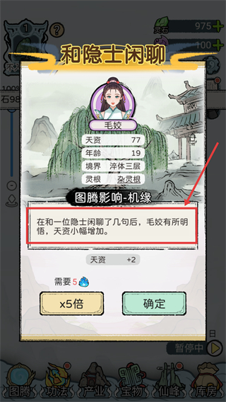 2、【和隐士闲聊】让角色毛姣天资小幅增加,消耗资源获属性加成,助力角色修炼成长。