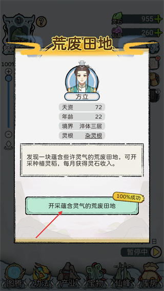 4、【荒废田地】开采种植灵稻,每月稳定获取灵石,保障修仙家族日常需求。