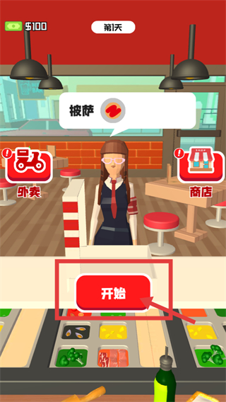 1、界面显示【第1天】,目标为【披萨】,点击标注的【开始】按钮进入制作流程,可借助【外卖】【商店】功能辅助后续操作。