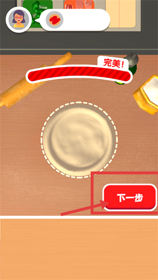 2、完成面团制作后出现【完美!】提示,点击标注的【下一步】按钮,推进披萨制作的后续步骤,提升制作进度。