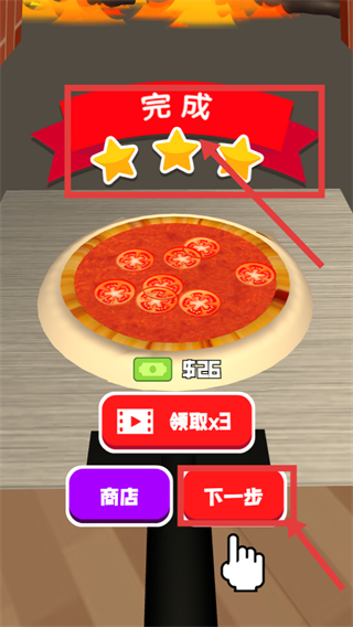 4、披萨制作完成获【三星】评价,界面显示【完成】,点击【下一步】进入后续制作,也可领取对应奖励资源。