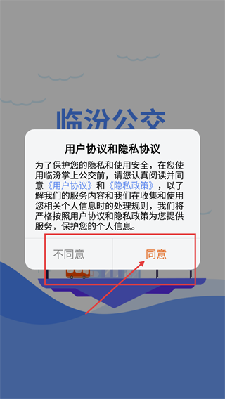1、打开临汾掌上公交后,在弹出的【用户协议和隐私协议】弹窗中,点击【同意】按钮,进入应用主界面。