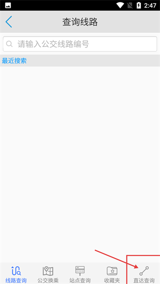 3、在查询线路页面,点击底部导航栏的【直达查询】选项,切换至直达查询的操作界面。