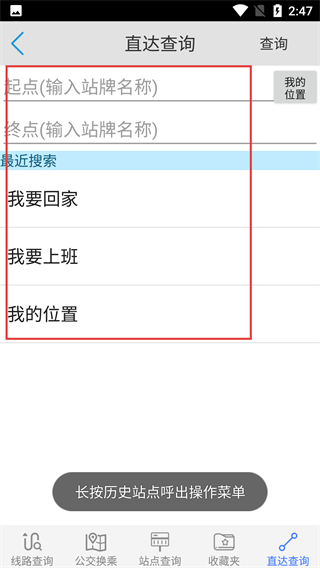 4、在直达查询页面,可在【起点】【终点】栏输入站牌名称,也可选择最近搜索中的快捷选项(如“我要回家”)快速设置行程。