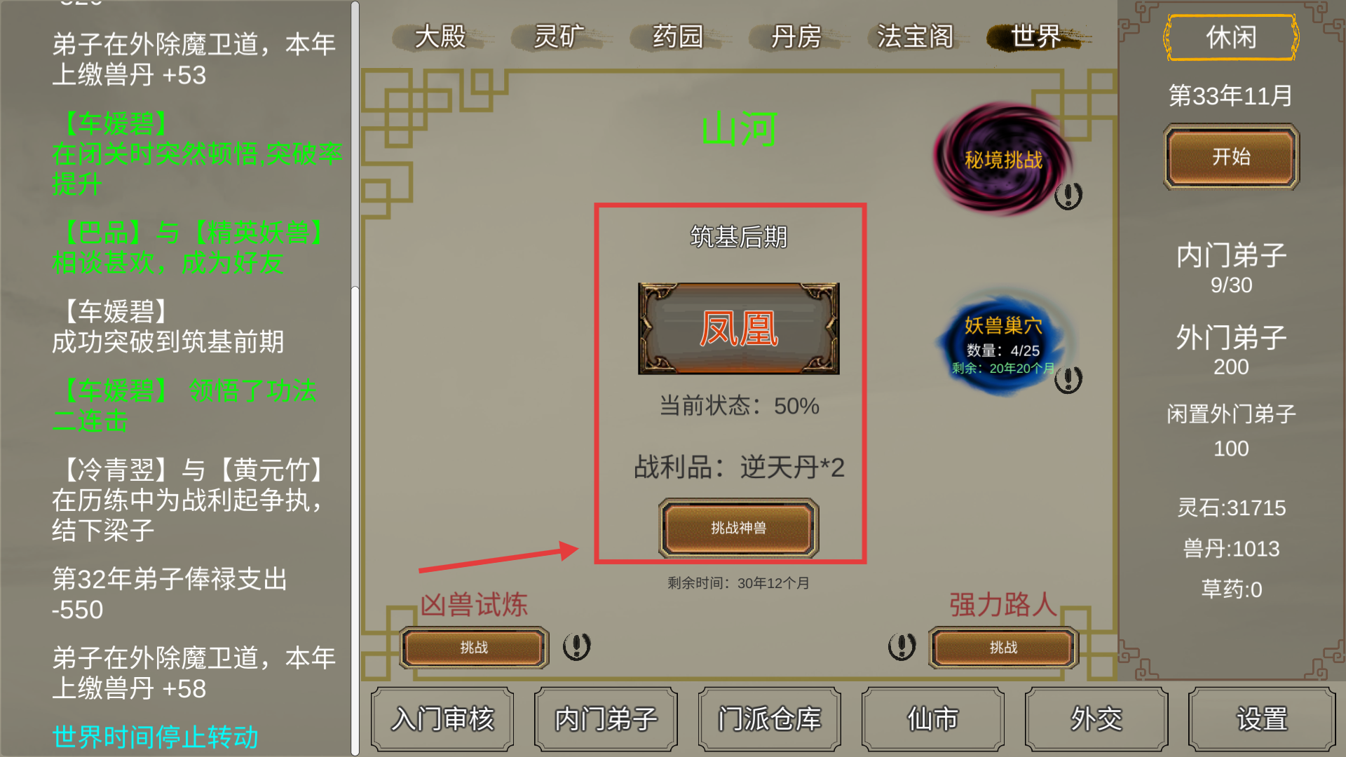 2、挑战【山河】界面的【凤凰】神兽,当前状态50%,成功后获取【逆天丹】助力弟子突破。