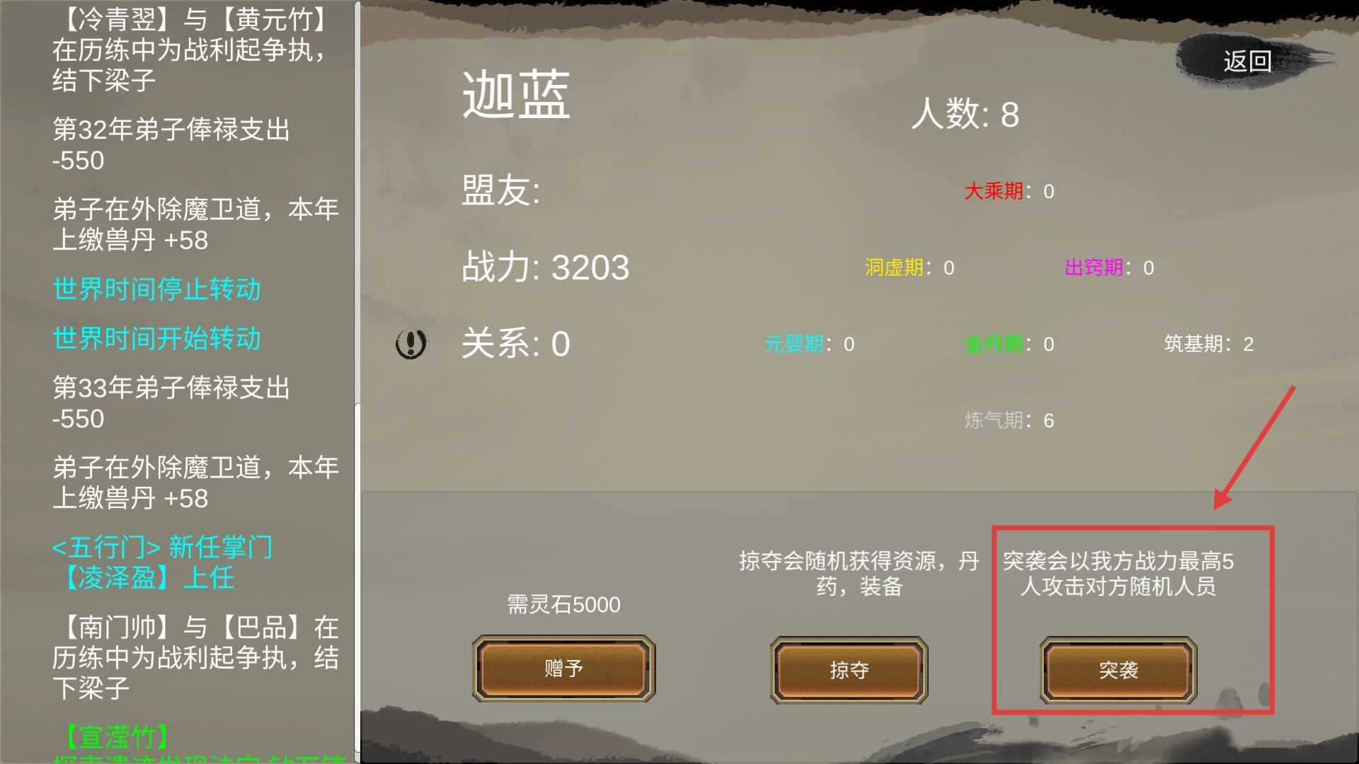 3、对【迦蓝】门派发起【突袭】,用我方高战力弟子攻击对方随机人员,快速获取资源。