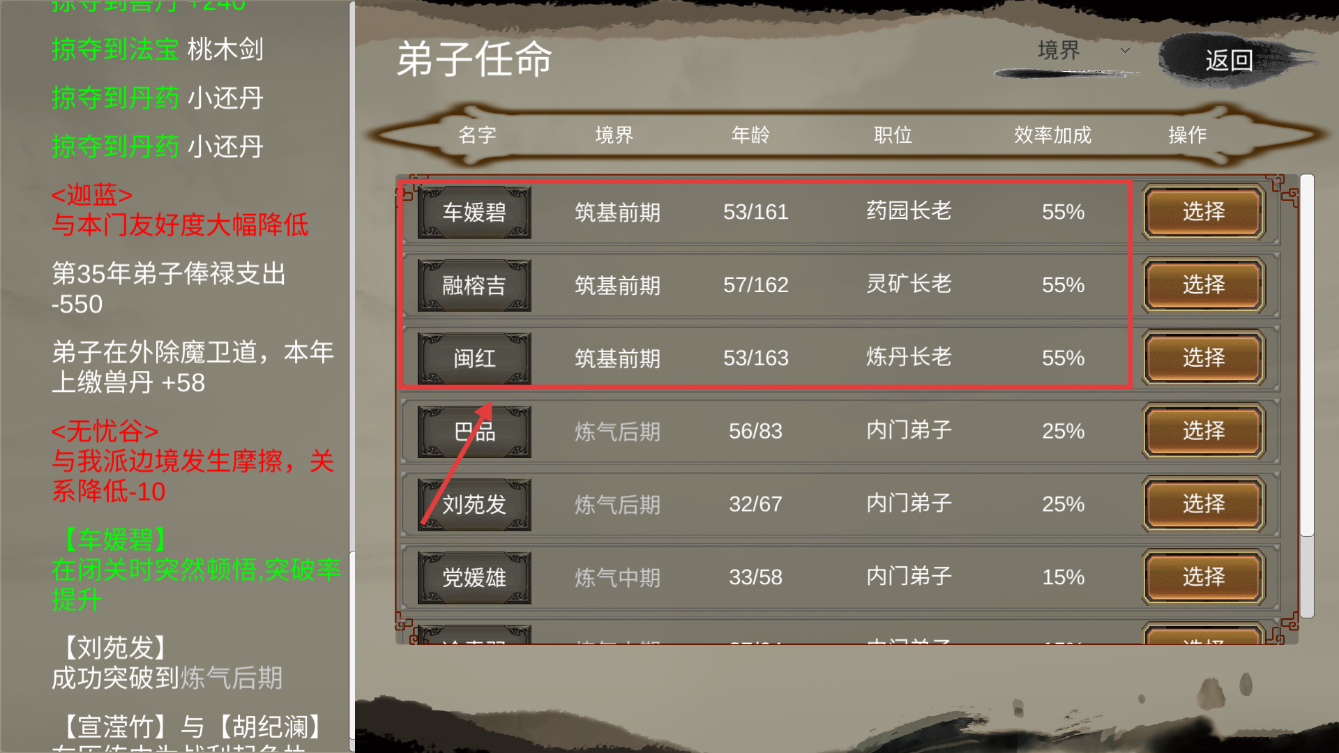 4、在【弟子任命】界面选【筑基前期】弟子任长老,如【药园长老】,提升资源生产效率。