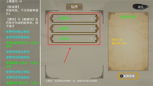 1、在【仙市】获取【储灵器】-【结金丹】-【含光剑】等道具,用于提升弟子实力与宗门建设的资源储备。