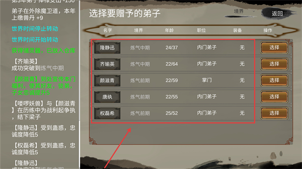 2、在弟子列表选择合适弟子如【隆静迅】-【齐瑜英】,赠予道具提升其修为忠诚度及宗门贡献。