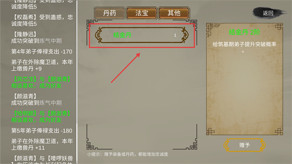 3、使用【结金丹】给筑基期弟子提升突破概率,助力弟子突破瓶颈稳固宗门整体实力基础。