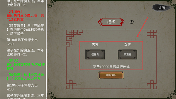 4、通过【结缘】系统安排【权磊希】与【颜滋青】结为道侣,增强宗门内部凝聚力与传承性。