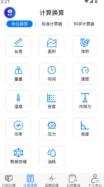 2、返回功能区,打开计算换算模块,可进行长度、体积、温度等多种换算操作。
