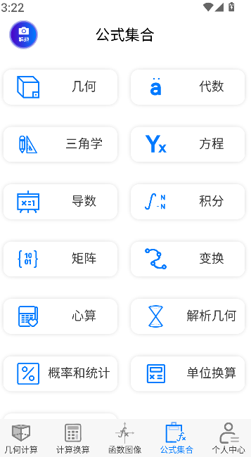 4、打开公式集合板块,可按分类查看常用数学公式,用于辅助学习与计算。